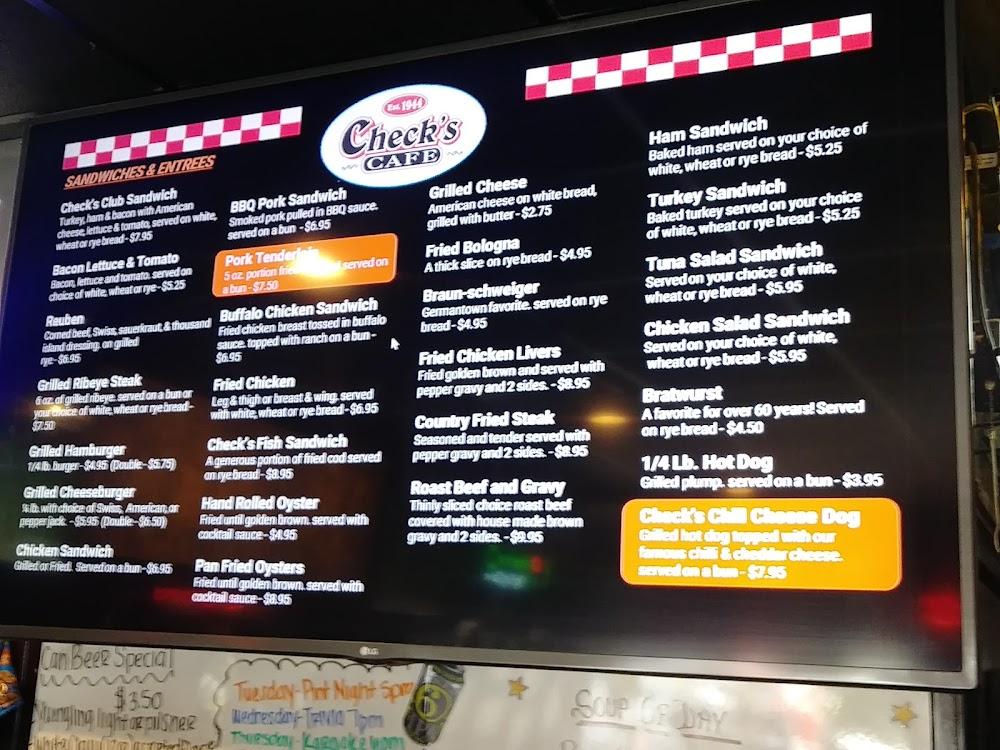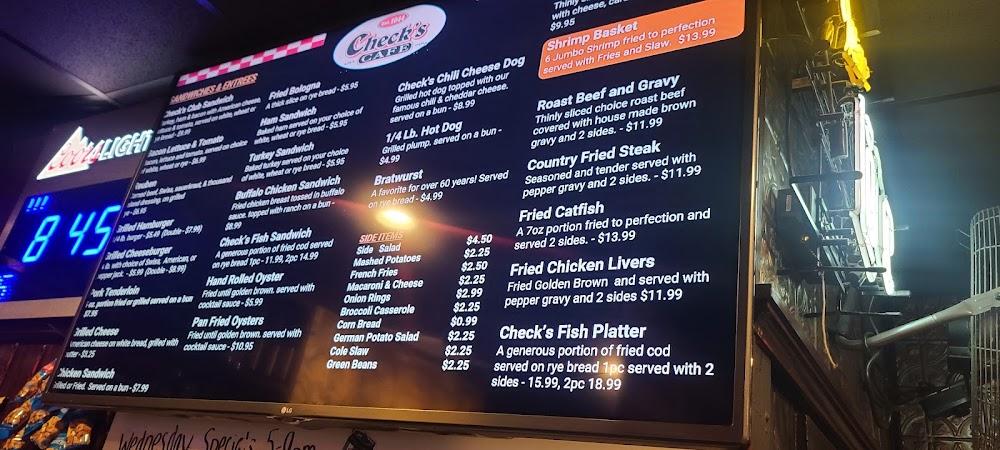 The menu at Check's Cafe offers a diverse range of American staples with a touch of German influence. Begin with appetizers like fried mushrooms or cheese sticks to share. Moving on, Check's Famous Chili and hearty bean soup are signature items, drawing loyal customers. Sandwiches range from classic burgers to inviting Reubens, perfect for any craving.